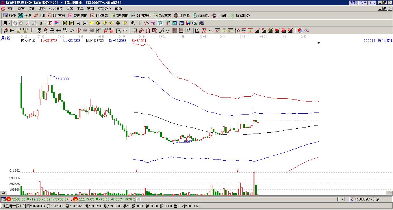 當天深圳瑞捷最高價18.97上穿了贏家極反通道工具生命線,受到生命線強力壓制,最終收盤停留在在生命線與藍色下軌線上方的弱勢通道區(qū)域。深圳瑞捷近10個交易日漲幅6.87%。