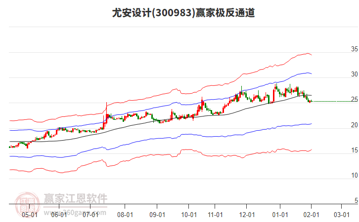 依據(jù)贏家江恩系統(tǒng)趨勢工具極反通道分析判斷尤安設計300983運行在生命線以下弱勢區(qū)域,根據(jù)規(guī)則該股短線輕倉參與,股價跌至弱勢外軌線后波段再結合其它工具信號建倉。應用口訣是:生命線上強勢走,生命線下難抬頭;紅黃兩條外軌線,壓力支撐顯勢頭。