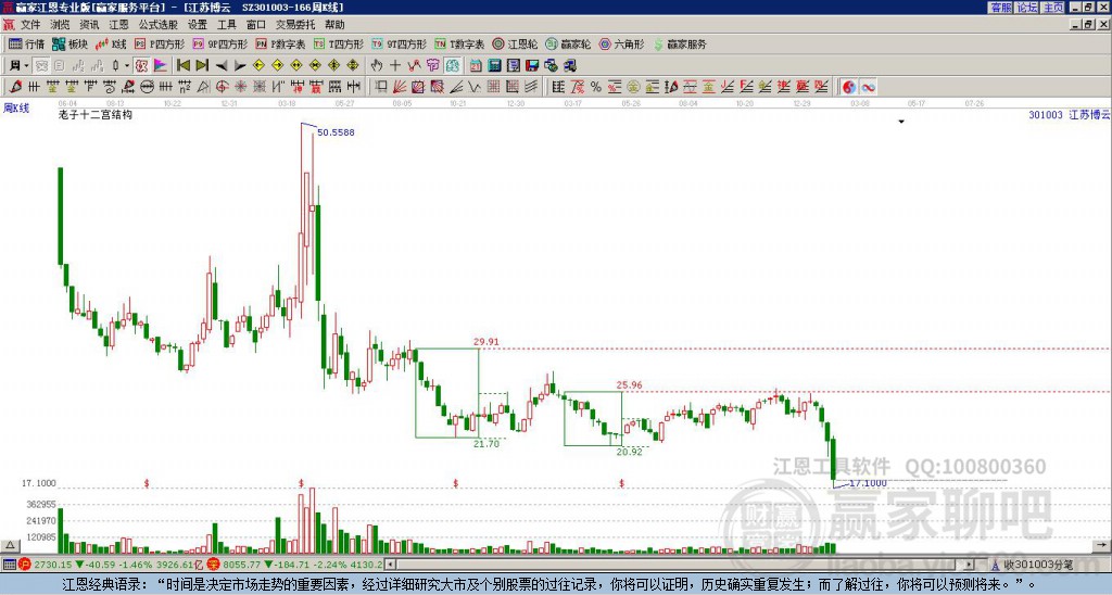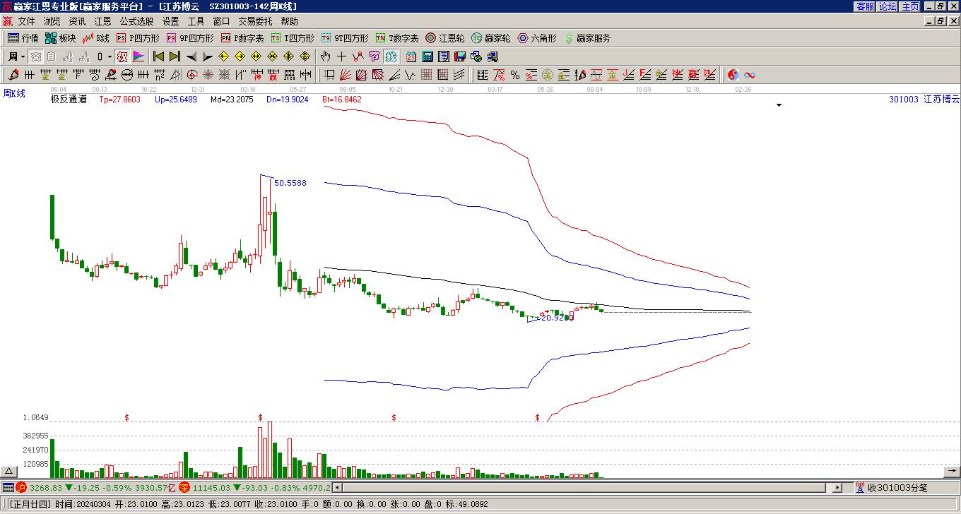 301003江蘇博云處于贏家江恩多頭主線形態(tài),11月21日發(fā)出江恩筑頂信號后,經(jīng)過17日,今日再次發(fā)出江恩底分型并發(fā)出江恩筑底信號,中期雖然處于回調(diào)中,但長期多頭趨勢延續(xù)。江蘇博云今日跳空高開,截止目