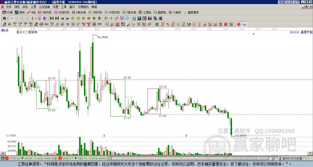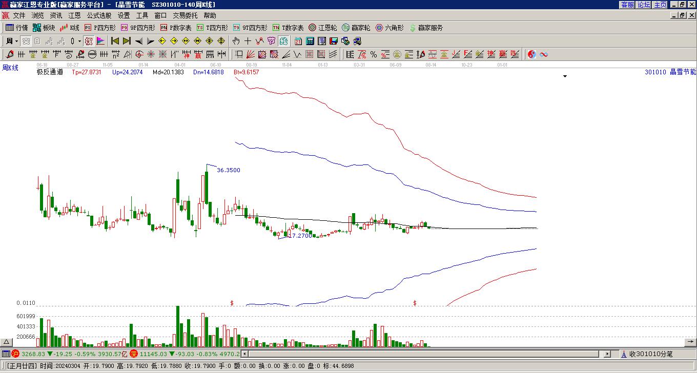 301010晶雪節(jié)能處于贏家江恩多頭主線形態(tài),12月10日發(fā)出江恩筑頂信號后,經(jīng)過36日,今日再次發(fā)出江恩底分型并發(fā)出江恩筑底信號,中長期目前都處于回調(diào)中。晶雪節(jié)能截至目前K線為上影小陰線,此K線說明