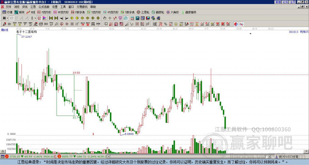 利和興處于贏家江恩多頭中期回調(diào)形態(tài),從1月7日形成頂分型后持續(xù)下跌,重心下移,今日跌破前低形成短期初次筑頂信號(hào),短期多頭趨勢(shì)已被破壞,中長(zhǎng)線均在空頭下跌趨勢(shì)中。利和興截至目前K線為穿頭破腳大陰線,這種