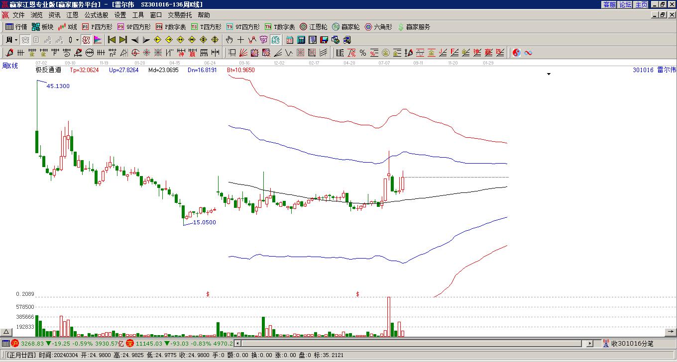 301016雷爾偉今日開盤價(jià)為22.44元,收盤價(jià)為26.51元,強(qiáng)勢(shì)漲停突破藍(lán)色上軌線