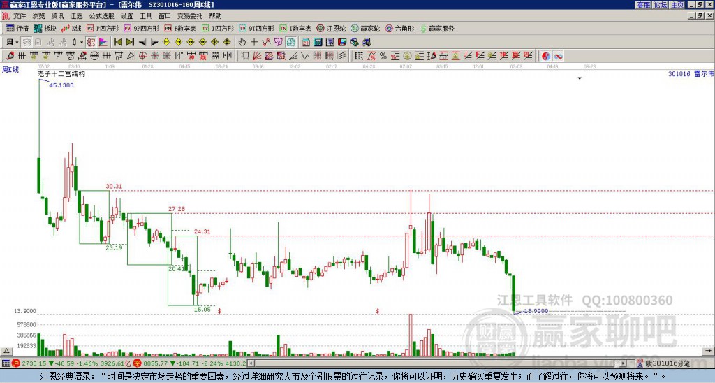 301016雷爾偉處于贏家江恩多頭次主線形態(tài),12月19日發(fā)出江恩筑底信號(hào)后,經(jīng)過56日,今日形成短期筑頂信號(hào),短期多頭趨勢(shì)已被破壞,中期雖然處于回調(diào)中,但長(zhǎng)期多頭趨勢(shì)延續(xù)。雷爾偉今日低開,截止目前微