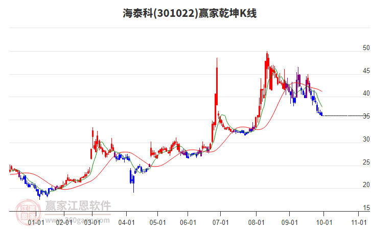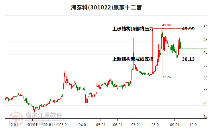依據(jù)贏家江恩系統(tǒng)趨勢工具極反通道分析判斷海泰科301022運(yùn)行在生命線以下弱勢區(qū)域,根據(jù)規(guī)則該股短線輕倉參與,股價(jià)跌至弱勢外軌線后波段再結(jié)合其它工具信號建倉。應(yīng)用口訣是:生命線上強(qiáng)勢走,生命線下難抬頭;紅黃兩條外軌線,壓力支撐顯勢頭。