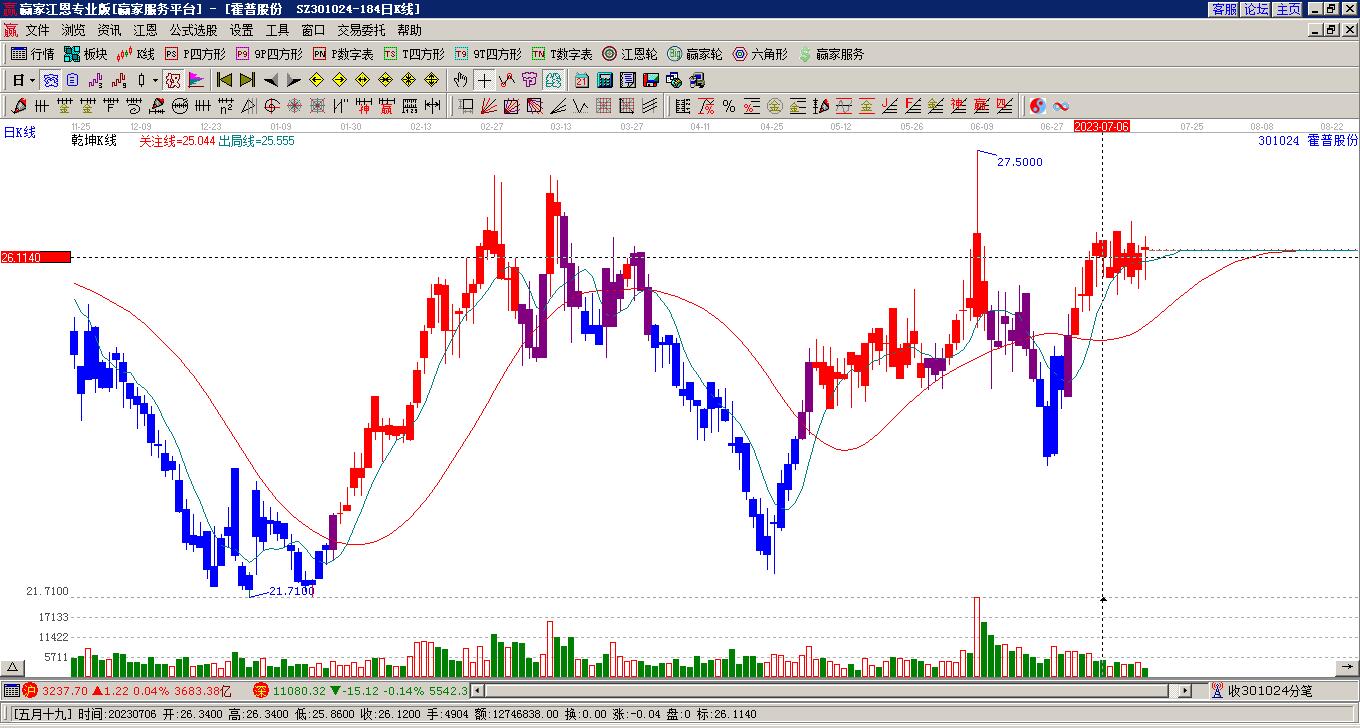 301024霍普股份處于贏家江恩多頭中期回調(diào)形態(tài),今日再次發(fā)出江恩底分型并發(fā)出江恩筑底信號,中長線均在空頭下跌趨勢中?;羝展煞萁袢仗崭唛_,截止目前K線上下影小陽線,上漲能量較為強勢。