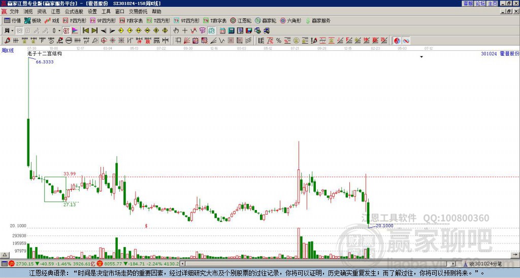 301024霍普股份處于贏家江恩多頭中期回調(diào)形態(tài),1月7日發(fā)出江恩筑底信號后,經(jīng)過36日,今日形成短期筑頂信號,短期多頭趨勢已被破壞,中長線均在空頭下跌趨勢中?;羝展煞萁袢仗盏烷_,截止目前K線為下影