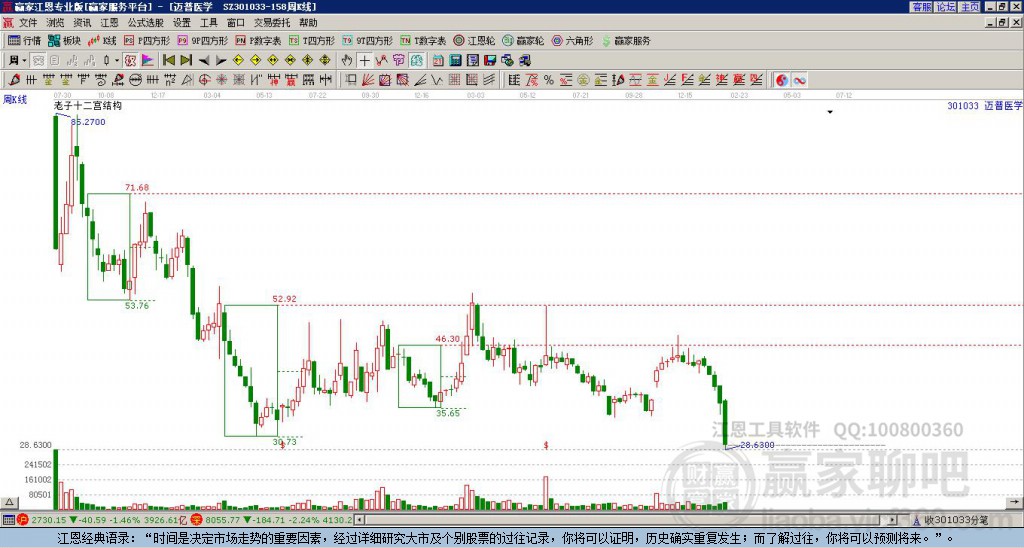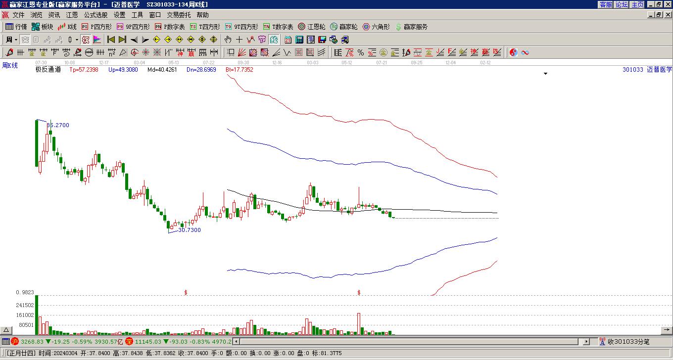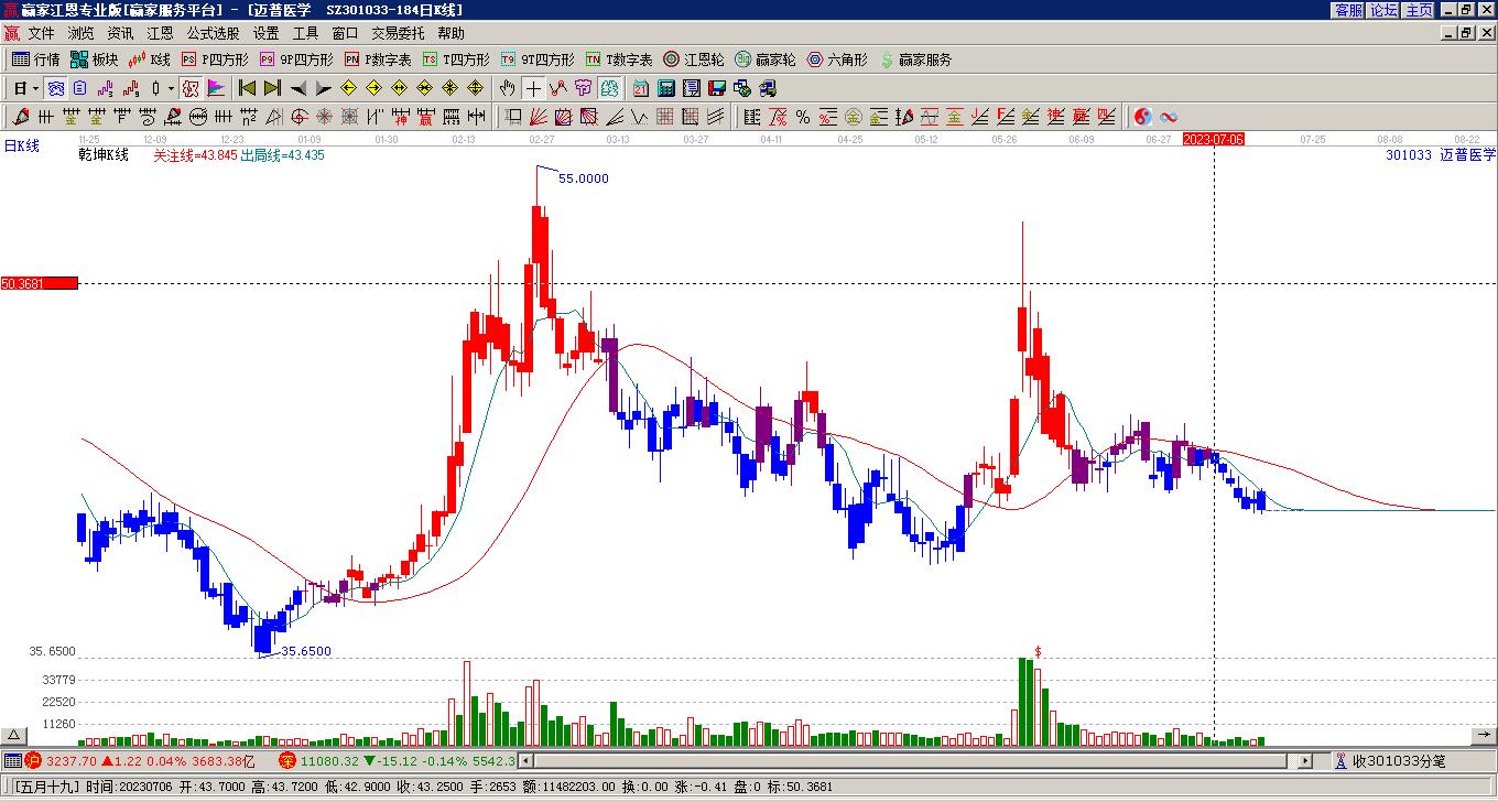 301033邁普醫(yī)學(xué)處于贏家江恩多頭中期回調(diào)形態(tài),從1月30日形成底分型后持續(xù)上攻,今日突破前高形成初次江恩筑底信號(hào),中期雖然處于下跌中,但長(zhǎng)期多頭趨勢(shì)延續(xù)。邁普醫(yī)學(xué)今日低開,截止目前小幅上漲2.05