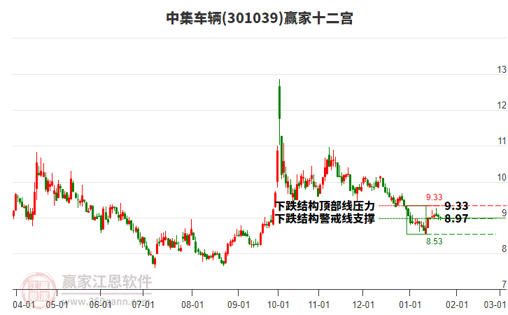 依據(jù)贏家江恩系統(tǒng)趨勢工具極反通道分析判斷中集車輛301039運(yùn)行在生命線以下弱勢區(qū)域,根據(jù)規(guī)則該股短線輕倉參與,股價跌至弱勢外軌線后波段再結(jié)合其它工具信號建倉。應(yīng)用口訣是:生命線上強(qiáng)勢走,生命線下難抬頭;紅黃兩條外軌線,壓力支撐顯勢頭。