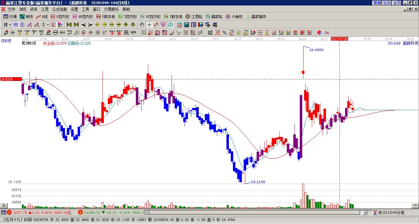 超越科技處于贏(yíng)家江恩空頭主線(xiàn)形態(tài),今日重心下移,形成短期筑頂信號(hào),長(zhǎng)期發(fā)出江恩筑頂信號(hào),注意風(fēng)險(xiǎn)規(guī)避。超越科技今日跳空低開(kāi),截止目前K線(xiàn)呈現(xiàn)上下影小陰線(xiàn),股價(jià)走弱。