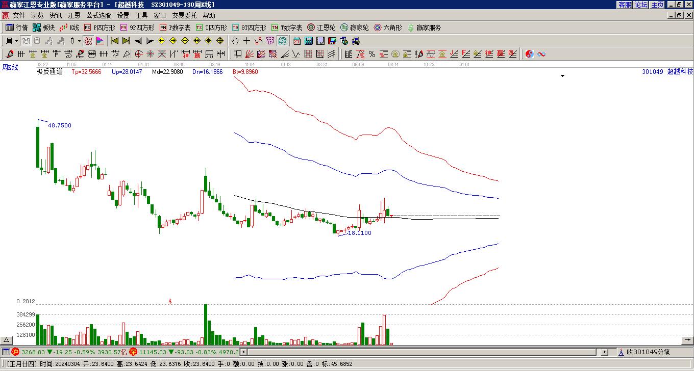 在2月第1周(2月2日-2月6日)中超越科技周漲幅為微漲4.01%。本周最高價(jià)為24.95元,出現(xiàn)在星期五,最低價(jià)為23.47元,出現(xiàn)在星期一。