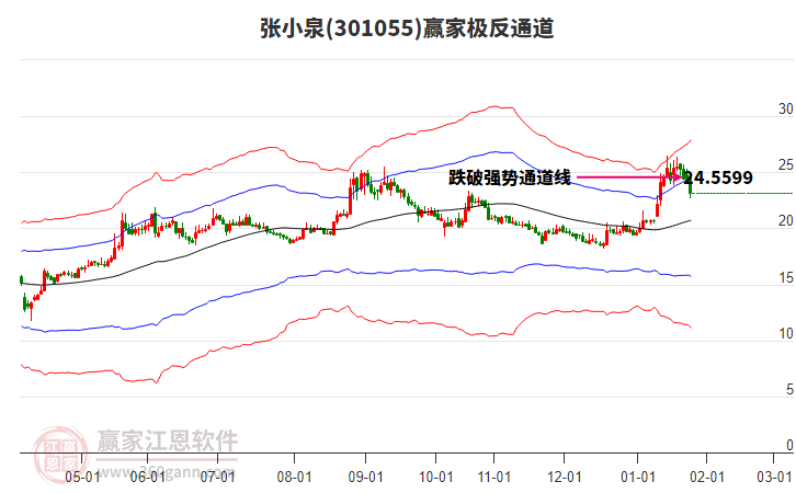 今天301055張小泉最高價(jià)26.48上穿了贏家極反通道工具上方紅色外軌線,受到上方紅色外軌線強(qiáng)力壓制,最終收盤(pán)停留在在上方紅色外軌線與藍(lán)色外軌線上方的超強(qiáng)通道區(qū)域。301055張小泉近10個(gè)交易日漲