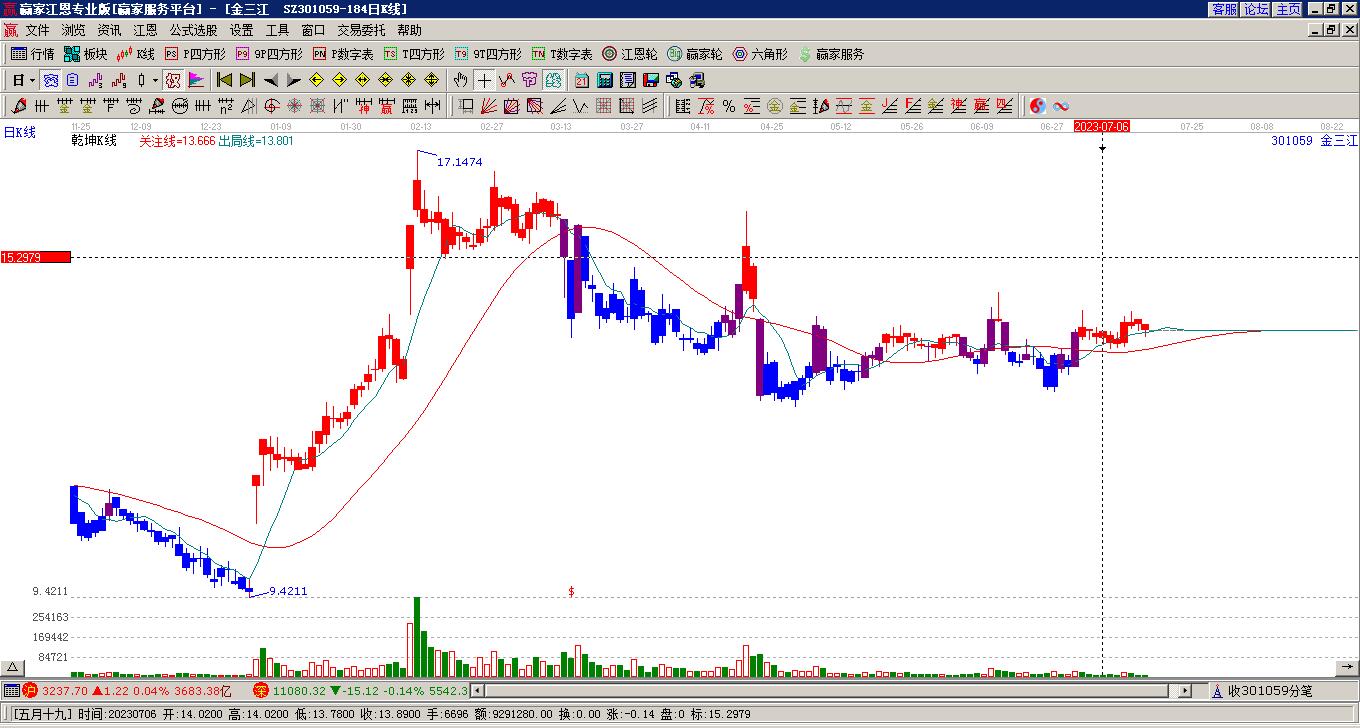 今日金三江最高價13.56上穿了贏家極反通道工具藍色外軌線,受到藍色外軌線強力壓制,最終收盤停留在在藍色外軌線與生命線上方的強勢通道區(qū)域。金三江近10個交易日漲幅2.41%。