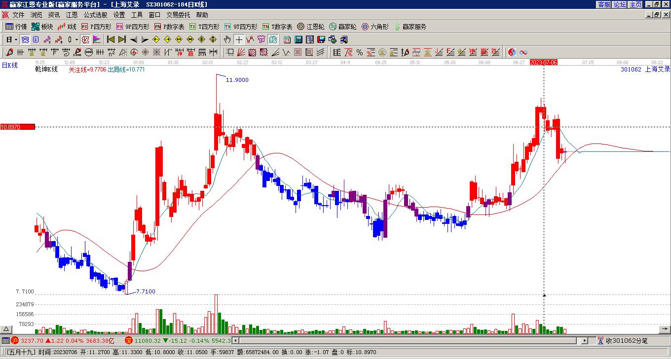 上海艾錄處于贏家江恩多頭主線形態(tài),今日重心上移,短期持續(xù)上漲,長期發(fā)出江恩筑底信號(hào),屬長期多頭預(yù)警。上海艾錄今日跳空高開,截止目前K線穿頭破腳大陽線,上漲能量較為強(qiáng)勢。