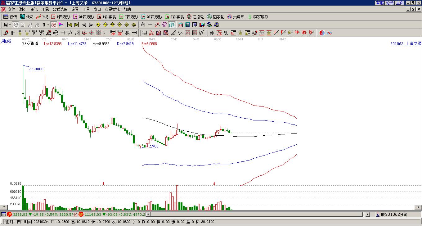 目前上海艾錄最高價(jià)10.06挑戰(zhàn)了贏家極反通道工具上方紅色外軌線,受到上方紅色外軌線強(qiáng)力壓制,最終收盤停留在在上方紅色外軌線與藍(lán)色外軌線上方的超強(qiáng)通道區(qū)域。上海艾錄近10個(gè)交易日漲幅17.39%。