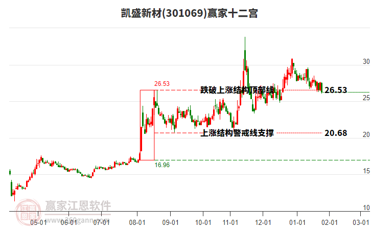 凱盛新材(301069)處于贏家江恩多頭次主線形態(tài),12月5日發(fā)出江恩筑底信號(hào)后,經(jīng)過47日,今日形成短期筑頂信號(hào),短期多頭趨勢(shì)已被破壞,中期雖然處于回調(diào)中,但長(zhǎng)期多頭趨勢(shì)延續(xù)。凱盛新材截至目前K線為