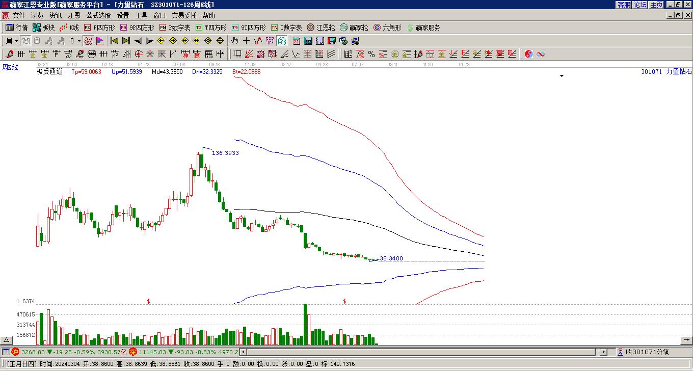 依據(jù)贏家江恩極反通道趨勢工具展示,本周股價(jià)處于生命線上強(qiáng)勢通道,本周收盤價(jià)40.42,自近期通道內(nèi)高點(diǎn)46.46持續(xù)下跌至本周,到達(dá)生命線33.3658點(diǎn)上方,短期關(guān)注此線支撐,如支撐不破,保持在強(qiáng)勢通道內(nèi),波段繼續(xù)看多,有望再次挑戰(zhàn)藍(lán)色上軌線。若跌破生命線33.3658,進(jìn)入弱勢通道,打開下跌空間。