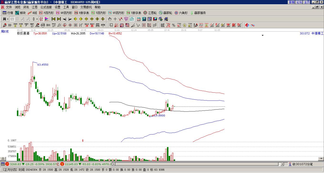 301072中捷精工處于贏家江恩多頭中期回調(diào)形態(tài),8月28日發(fā)出江恩筑頂信號后,經(jīng)過78日,今日再次發(fā)出江恩底分型并發(fā)出江恩筑底信號,中長線均在空頭下跌趨勢中。中捷精工今日低開,截止目前微漲1.81%