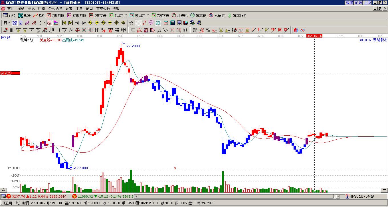 新瀚新材處于贏家江恩多頭次主線形態(tài),從12月9日形成頂分型后持續(xù)下跌,重心下移,今日跌破前低形成短期初次筑頂信號,短期多頭趨勢已被破壞,中期多頭趨勢延續(xù),但長期處于回調(diào)中。新瀚新材今日跳空低開,截止目
