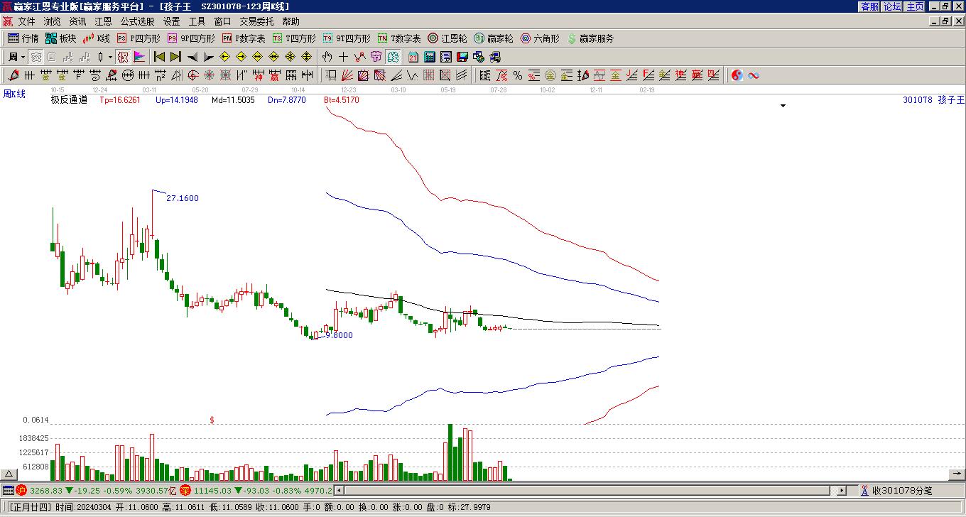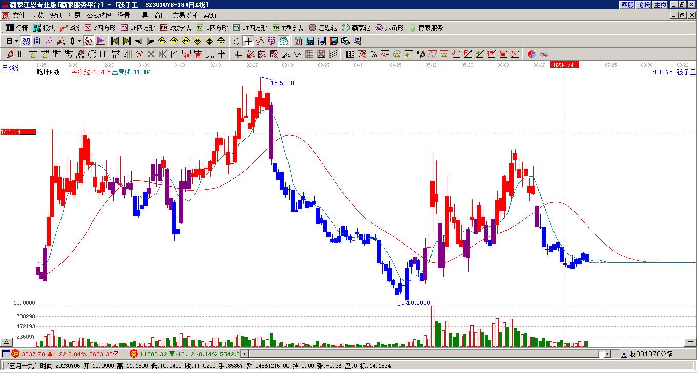 今日孩子王最高價11.88挑戰(zhàn)了贏家極反通道工具藍色外軌線,受到藍色外軌線強力壓制,最終收盤停留在在藍色外軌線與生命線上方的強勢通道區(qū)域。孩子王近10個交易日漲幅11.07%。