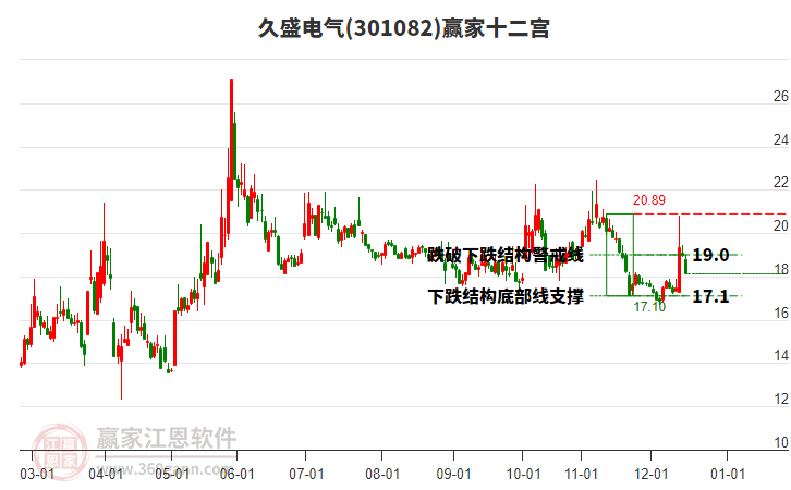 301082久盛電氣處于贏家江恩多頭中期回調(diào)形態(tài),今日重心下移,形成短期筑頂信號,從11月7日形成中期頂分型后中期重心持續(xù)下移,今日跌破前低形成初次筑頂信號,長期處于多頭回調(diào)趨勢。久盛電氣今日跳空低開