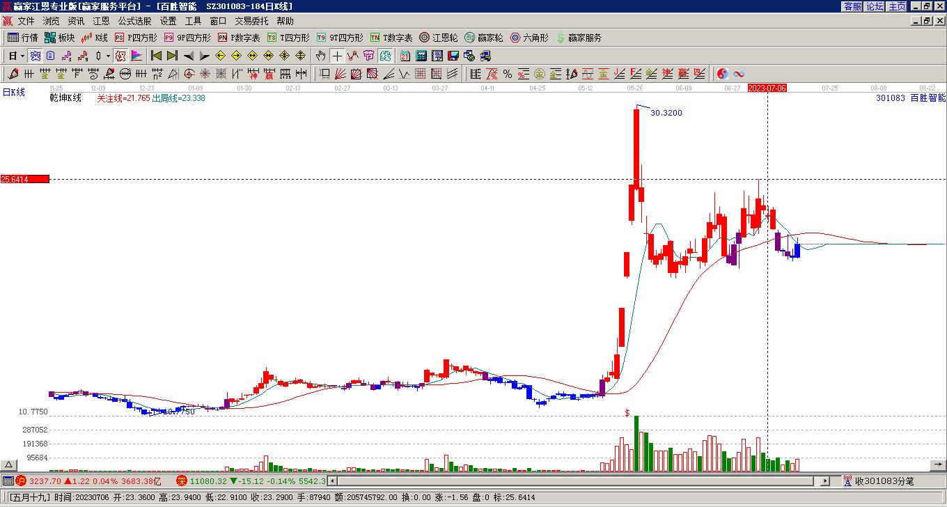 301083百勝智能處于贏家江恩多頭主線形態(tài),從12月30日形成底分型后持續(xù)上攻,今日突破前高形成初次江恩筑底信號(hào),中期雖然處于回調(diào)中,但長(zhǎng)期多頭趨勢(shì)延續(xù)。百勝智能今日跳空高開,截止目前雖為上影陰線,