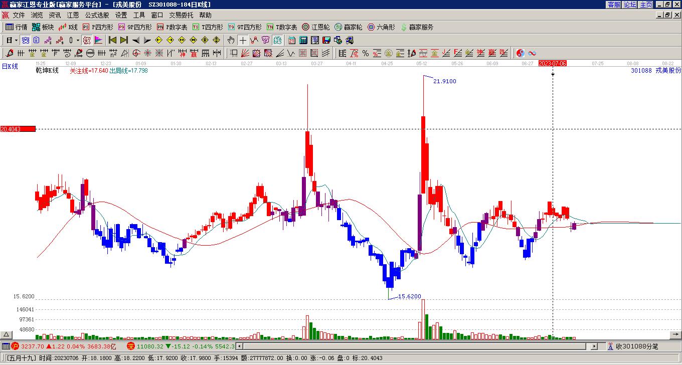 周四戎美股份301088上穿藍(lán)色外軌線 以中陽線收盤