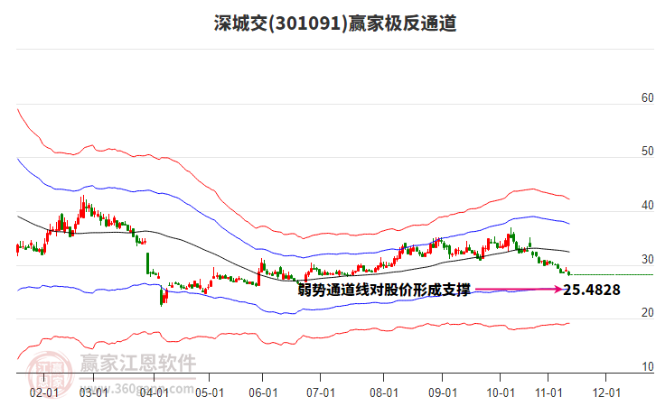 依據(jù)贏家江恩系統(tǒng)趨勢工具極反通道分析判斷深城交301091運行在生命線以下弱勢區(qū)域,根據(jù)規(guī)則該股短線輕倉參與,股價跌至弱勢外軌線后波段再結(jié)合其它工具信號建倉。應(yīng)用口訣是:生命線上強勢走,生命線下難抬頭;紅黃兩條外軌線,壓力支撐顯勢頭。