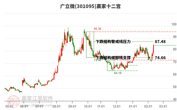 當前股價位于前期2025年10月20日形成的下跌結構頂部線95.36與警戒線87.48之間,該股自近期低點71.2,漲至今日89.22,共上漲18.02元,漲幅25.31%。依據(jù)贏家十二宮多空能量守恒規(guī)則,下跌結構警戒線是多空能量平衡爭奪點,突破或跌破往往意味著平衡打破。當前股價若能站穩(wěn)警戒線位置,多方能量有望主導上攻,向上頂部線位置尋找多空能量平衡位。如股價不能有效站穩(wěn)警戒線,則空方能量主導下探,向底部線附近尋找新的多空能量平衡位。