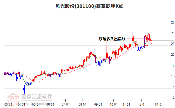 301100風(fēng)光股份處于贏家江恩多頭主線形態(tài),從11月21日形成底分型后持續(xù)上攻,今日突破前高形成初次江恩筑底信號,中長期多頭趨勢依舊保持。風(fēng)光股份今日低開,截止目前小幅上漲3.26%,K線為光腳長上