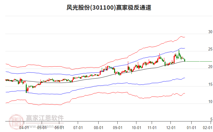 依據(jù)贏家江恩系統(tǒng)趨勢工具極反通道分析判斷風(fēng)光股份301100運行在生命線以下弱勢區(qū)域,根據(jù)規(guī)則該股短線輕倉參與,股價跌至弱勢外軌線后波段再結(jié)合其它工具信號建倉。應(yīng)用口訣是:生命線上強勢走,生命線下難抬頭;紅黃兩條外軌線,壓力支撐顯勢頭。