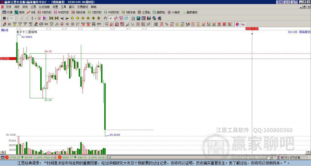 301105鴻銘股份處于贏家江恩多頭次主線形態(tài),從12月8日形成頂分型后持續(xù)下跌,重心下移,今日跌破前低形成短期初次筑頂信號,短期多頭趨勢已被破壞,中長期多頭趨勢依舊保持。鴻銘股份今日跳空低開,目前K