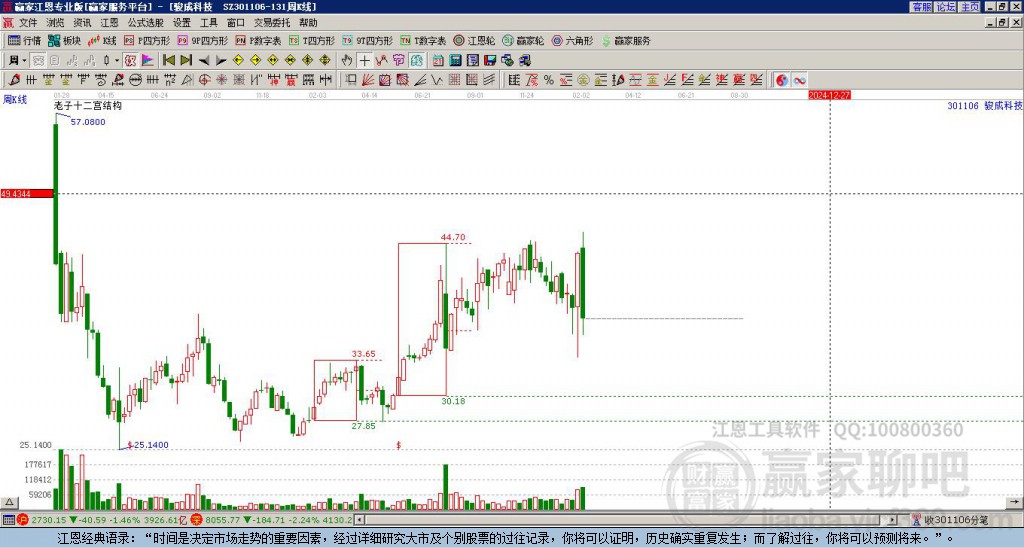 301106駿成科技處于贏家江恩多頭主線形態(tài),12月16日發(fā)出江恩筑頂信號(hào)后,經(jīng)過57日,今日再次發(fā)出江恩底分型并發(fā)出江恩筑底信號(hào),中長期多頭趨勢(shì)依舊保持。駿成科技今日雖高開,截止目前股價(jià)低于昨日收盤