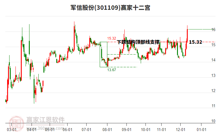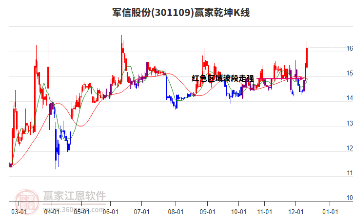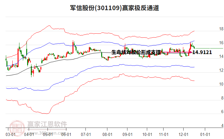 今日軍信股份301109最高價(jià)16.41挑戰(zhàn)了贏家極反通道工具藍(lán)色外軌線,受到藍(lán)色外軌線強(qiáng)力壓制,最終收盤停留在在藍(lán)色外軌線與生命線上方的強(qiáng)勢(shì)通道區(qū)域。軍信股份301109近10個(gè)交易日漲幅13.01