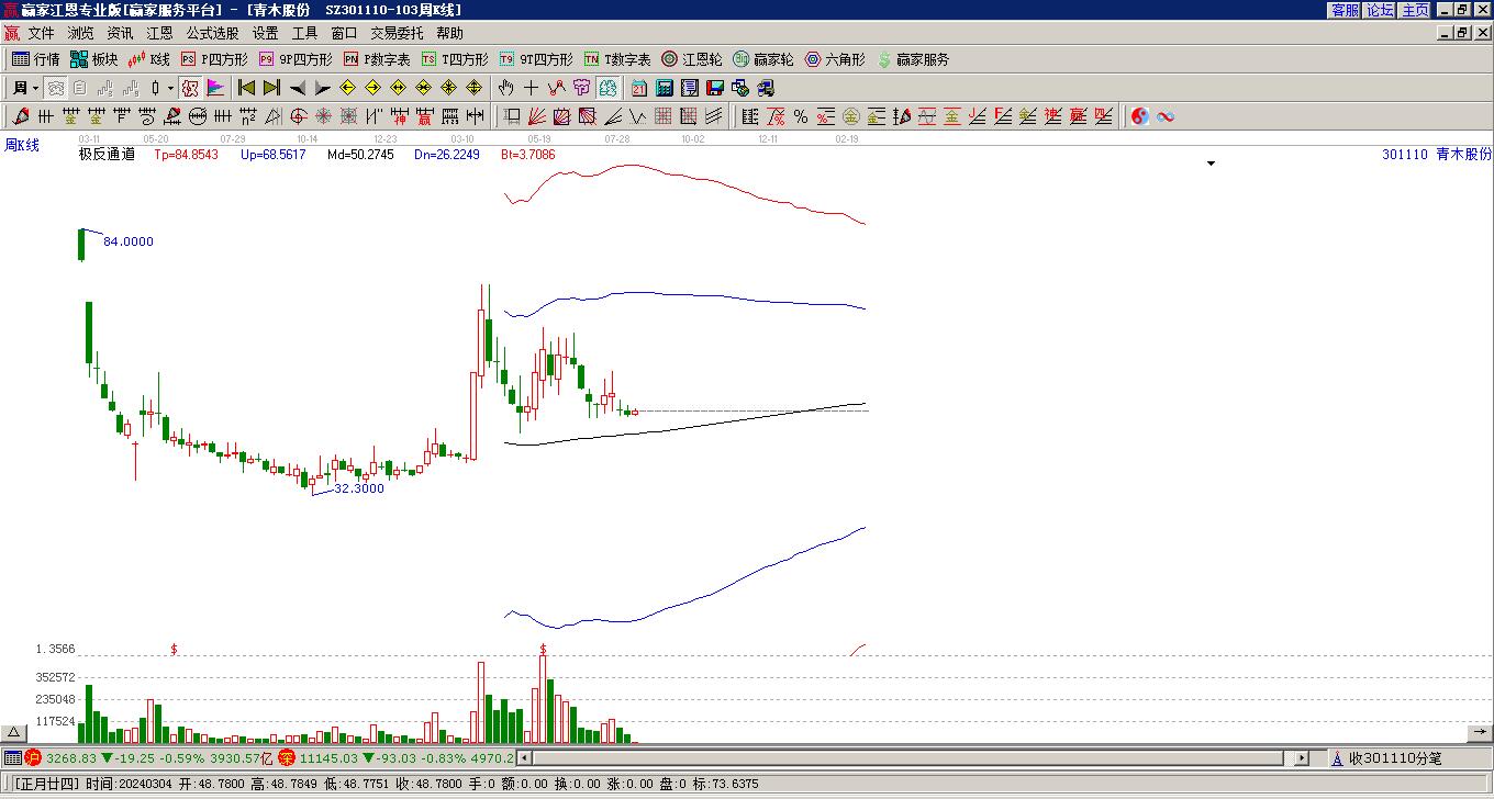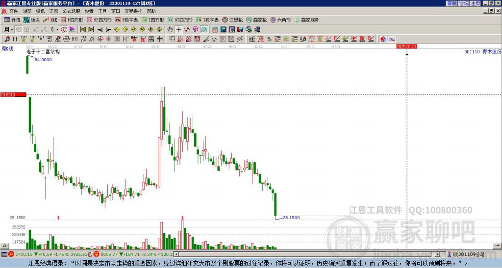 301110青木科技處于贏家江恩多頭次主線形態(tài),12月31日發(fā)出江恩筑底信號(hào)后,經(jīng)過(guò)33日,今日形成短期筑頂信號(hào),短期多頭趨勢(shì)已被破壞,中長(zhǎng)期多頭趨勢(shì)依舊保持。青木科技今日跳空低開(kāi),截止目前K線呈現(xiàn)上