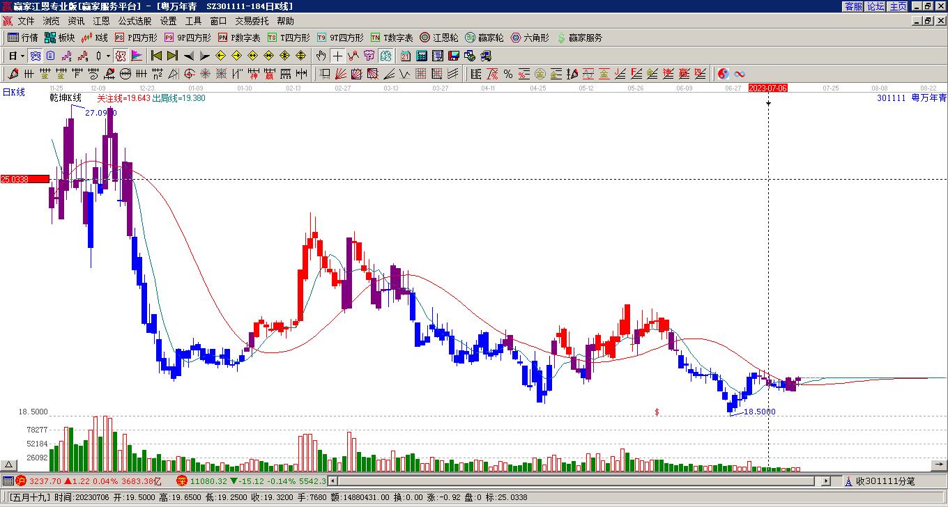 301111粵萬年青處于贏家江恩多頭中期回調(diào)形態(tài),今日重心持續(xù)下移,短期延續(xù)下跌趨勢(shì),11月26日發(fā)出中期江恩筑底信號(hào)后,經(jīng)過68日,今日形成中期筑頂信號(hào),若持續(xù)下跌,觸發(fā)長(zhǎng)期筑頂信號(hào),301111粵
