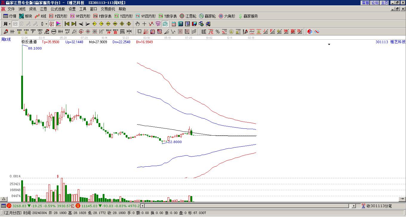 雅藝科技(301113)本周股價出現下跌,本周微跌0.73%,近半個月股價呈震蕩趨勢,本周最高價為27.63元,出現在星期一,最低價為24.52元,出現在1月29日