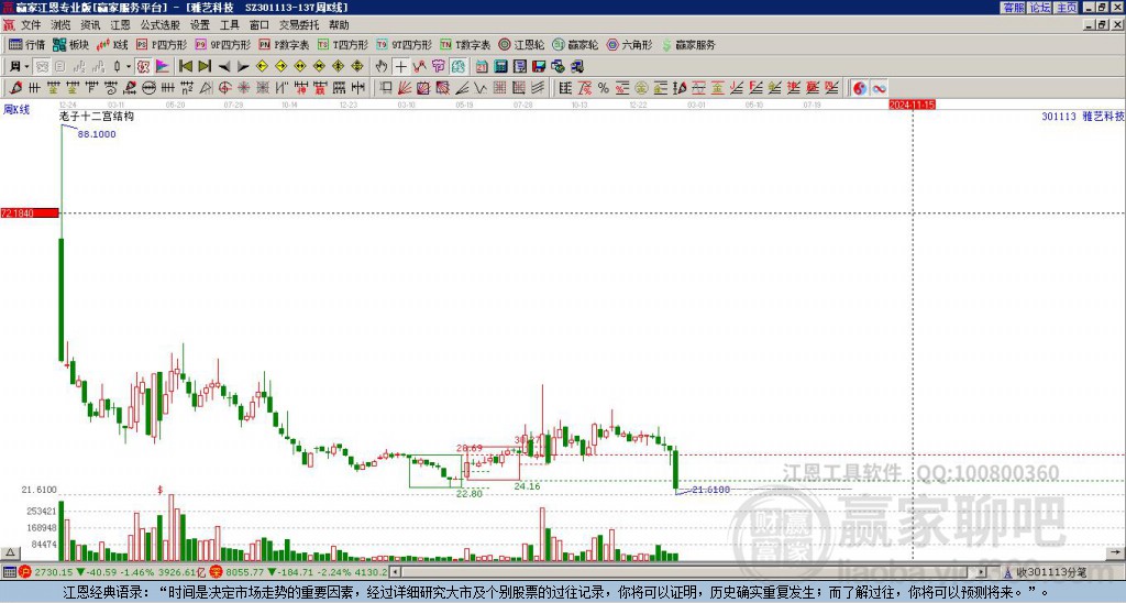 301113雅藝科技處于贏家江恩多頭次主線形態(tài),從11月19日形成頂分型后持續(xù)下跌,重心下移,今日跌破前低形成短期初次筑頂信號,短期多頭趨勢已被破壞,中長期多頭趨勢依舊保持。雅藝科技目前K線為上影小陰