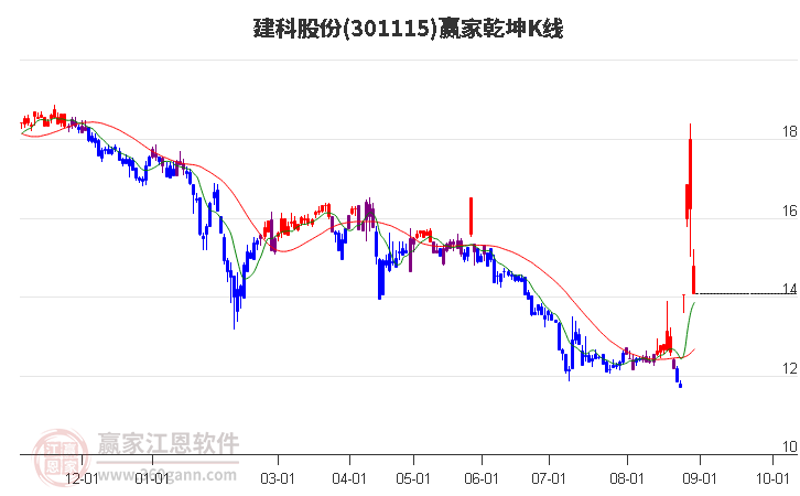 依據(jù)贏家江恩系統(tǒng)趨勢工具極反通道分析判斷建科股份301115運(yùn)行在生命線以下弱勢區(qū)域,根據(jù)規(guī)則該股短線輕倉參與,股價(jià)跌至弱勢外軌線后波段再結(jié)合其它工具信號(hào)建倉。應(yīng)用口訣是:生命線上強(qiáng)勢走,生命線下難抬頭;紅黃兩條外軌線,壓力支撐顯勢頭。