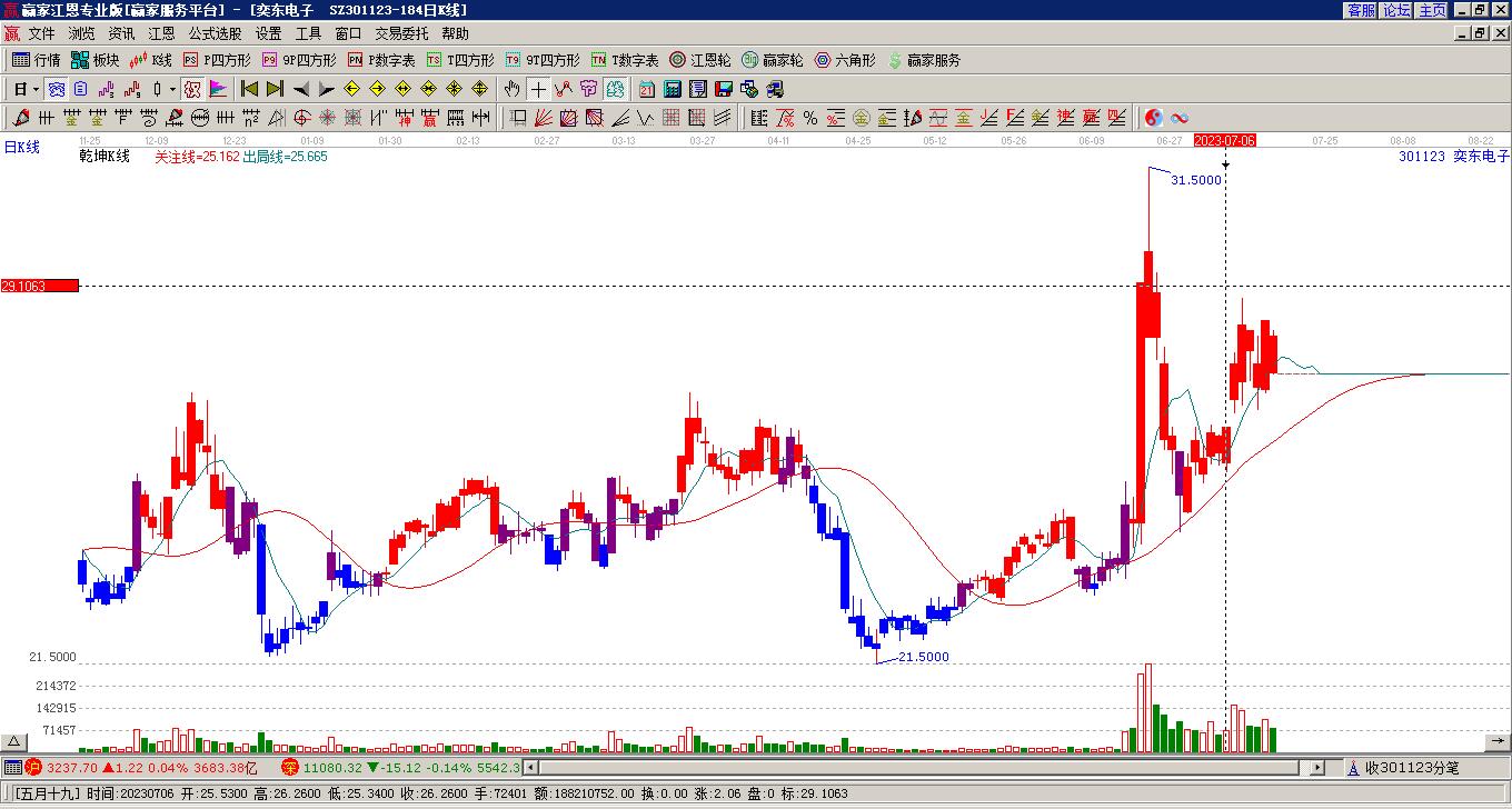 301123奕東電子處于贏家江恩多頭次主線形態(tài),12月5日發(fā)出江恩筑底信號(hào)后,經(jīng)過53日,今日形成短期筑頂信號(hào),短期多頭趨勢(shì)已被破壞,中期雖然處于回調(diào)中,但長期多頭趨勢(shì)延續(xù)。奕東電子今日跳空低開,目前