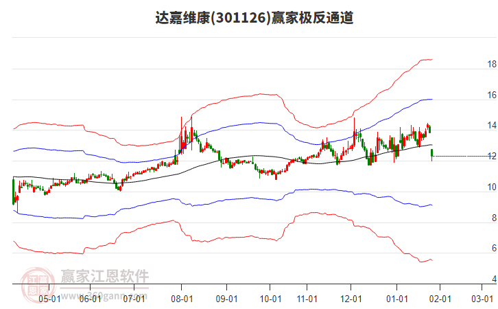 依據(jù)贏家江恩系統(tǒng)趨勢(shì)工具極反通道分析判斷達(dá)嘉維康301126運(yùn)行在生命線以下弱勢(shì)區(qū)域,根據(jù)規(guī)則該股短線輕倉參與,股價(jià)跌至弱勢(shì)外軌線后波段再結(jié)合其它工具信號(hào)建倉。應(yīng)用口訣是:生命線上強(qiáng)勢(shì)走,生命線下難抬頭;紅黃兩條外軌線,壓力支撐顯勢(shì)頭。