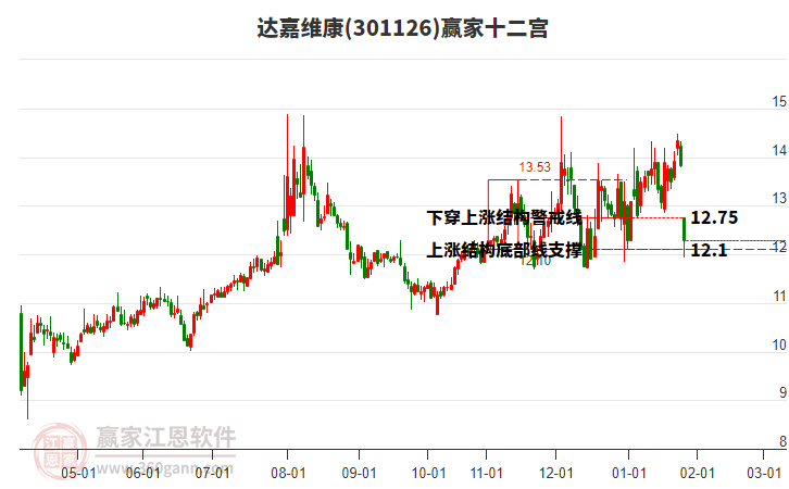301126達(dá)嘉維康處于贏家江恩多頭次主線形態(tài),從1月23日形成頂分型后持續(xù)下跌,重心下移,今日跌破前低形成短期初次筑頂信號(hào),短期多頭趨勢(shì)已被破壞,中長期多頭趨勢(shì)依舊保持。達(dá)嘉維康截至目前K線為光頭下