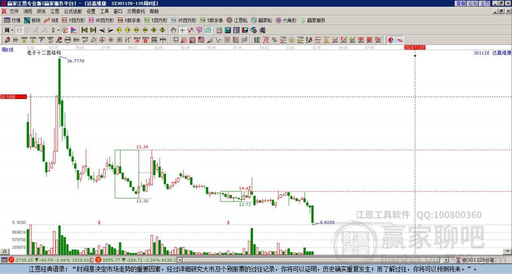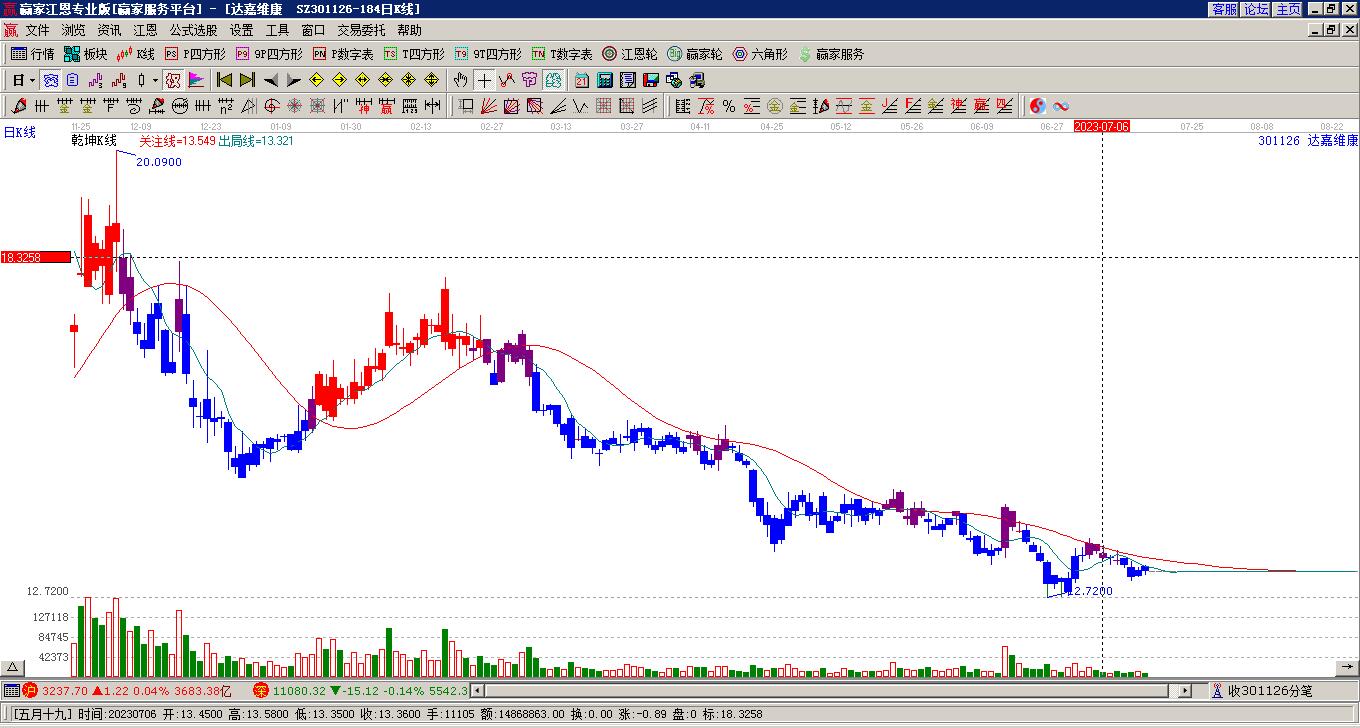 301126達(dá)嘉維康處于贏家江恩多頭次主線形態(tài),從1月23日形成頂分型后持續(xù)下跌,重心下移,今日跌破前低形成短期初次筑頂信號(hào),短期多頭趨勢已被破壞,中長期多頭趨勢依舊保持。達(dá)嘉維康截至目前K線為光頭下