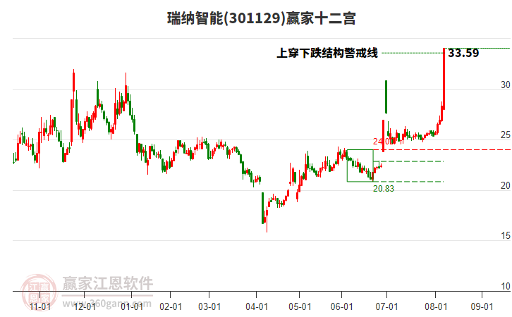 依據(jù)贏家江恩系統(tǒng)趨勢工具極反通道分析判斷瑞納智能301129運行在生命線以下弱勢區(qū)域,根據(jù)規(guī)則該股短線輕倉參與,股價跌至弱勢外軌線后波段再結合其它工具信號建倉。應用口訣是:生命線上強勢走,生命線下難抬頭;紅黃兩條外軌線,壓力支撐顯勢頭。