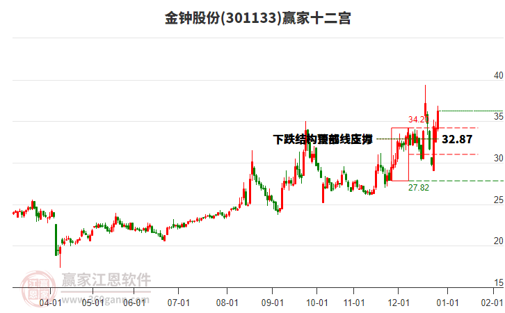 依據(jù)贏家江恩系統(tǒng)趨勢(shì)工具極反通道分析判斷金鐘股份301133運(yùn)行在生命線以下弱勢(shì)區(qū)域,根據(jù)規(guī)則該股短線輕倉參與,股價(jià)跌至弱勢(shì)外軌線后波段再結(jié)合其它工具信號(hào)建倉。應(yīng)用口訣是:生命線上強(qiáng)勢(shì)走,生命線下難抬頭;紅黃兩條外軌線,壓力支撐顯勢(shì)頭。
