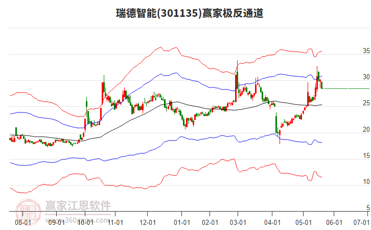 依據(jù)贏家江恩系統(tǒng)趨勢工具極反通道分析判斷瑞德智能301135運行在生命線以下弱勢區(qū)域,根據(jù)規(guī)則該股短線輕倉參與,股價跌至弱勢外軌線后波段再結合其它工具信號建倉。應用口訣是:生命線上強勢走,生命線下難抬頭;紅黃兩條外軌線,壓力支撐顯勢頭。