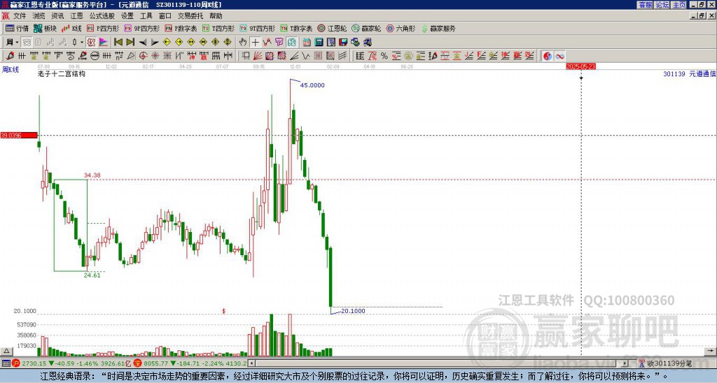 元道通信(301139)處于贏家江恩空頭主線(xiàn)形態(tài),1月5日發(fā)出江恩筑底信號(hào)后,經(jīng)過(guò)24日,今日形成短期筑頂信號(hào),短期多頭趨勢(shì)已被破壞,中長(zhǎng)期目前都處于反彈中。元道通信今日跳空低開(kāi),截止目前K線(xiàn)呈現(xiàn)光頭