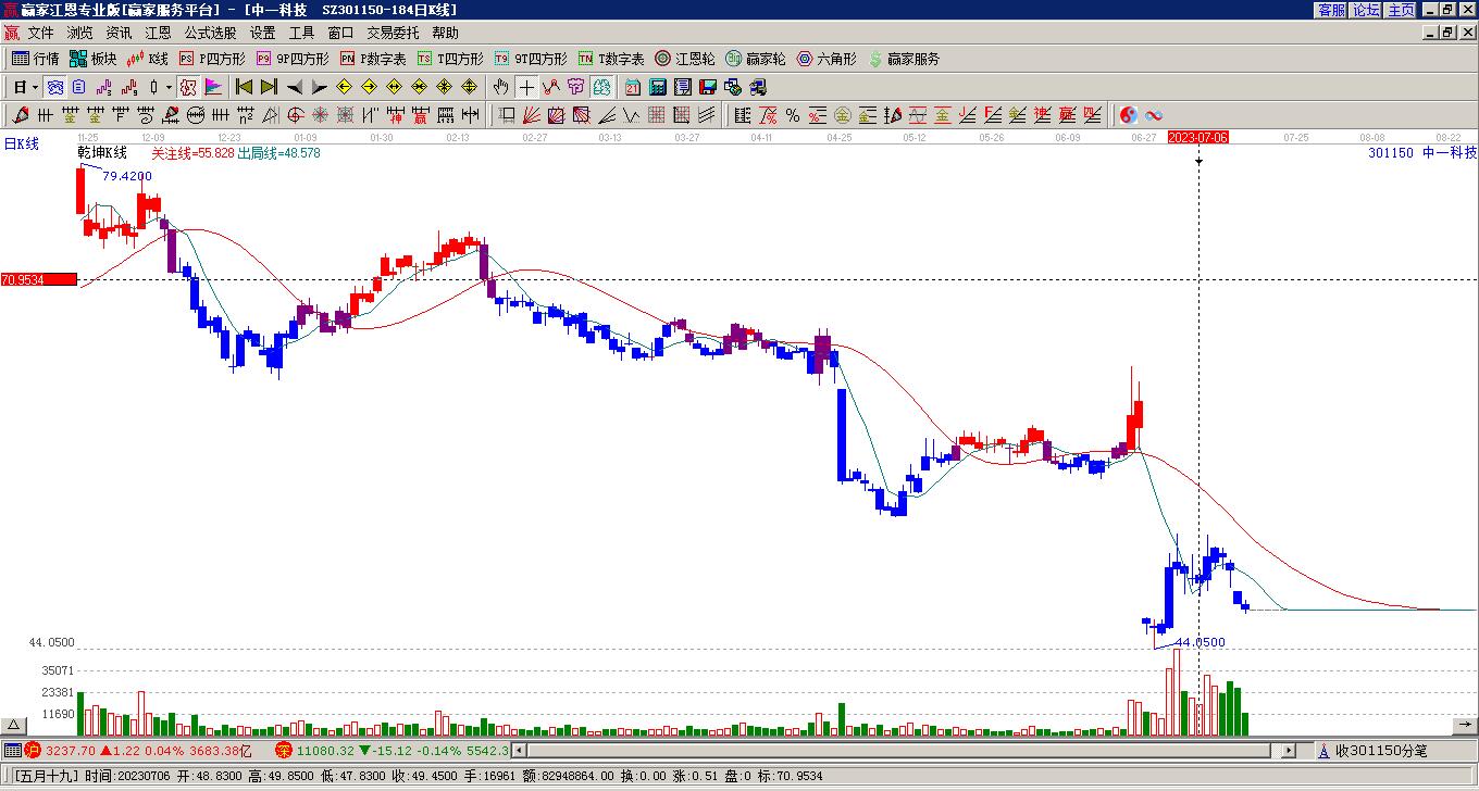 301150中一科技處于贏家江恩多頭中期回調(diào)形態(tài),今日重心持續(xù)下移,短期延續(xù)下跌趨勢,6月19日發(fā)出中期江恩筑底信號后,經(jīng)過228日,今日形成中期筑頂信號,若持續(xù)下跌,觸發(fā)長期筑頂信號,301150中