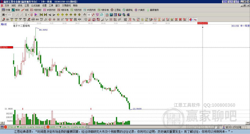 中一科技處于贏家江恩多頭主線形態(tài),從1月21日形成底分型后持續(xù)上攻,今日突破前高形成初次江恩筑底信號,中長期多頭趨勢依舊保持。中一科技今日雖高開,截止目前股價低于昨日收盤價,呈下跌走勢。