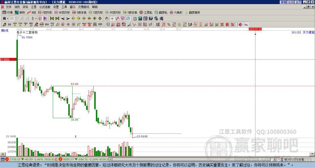 301152天力鋰能處于贏家江恩空頭中期反彈形態(tài),從1月26日形成頂分型后持續(xù)下跌,重心下移,今日跌破前低形成短期初次筑頂信號,短期多頭趨勢已被破壞,中長期多頭趨勢依舊保持。天力鋰能今日跳空低開,截止