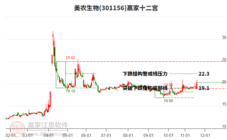 301156美農(nóng)生物處于贏家江恩多頭中期回調(diào)形態(tài),11月18日發(fā)出江恩筑頂信號后,經(jīng)過48日,今日再次發(fā)出江恩底分型并發(fā)出江恩筑底信號,中期多頭反彈趨勢延續(xù),但長期處于回調(diào)中。美農(nóng)生物截至目前K線為上